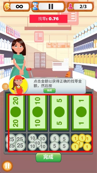 把数字计算和操作流程深度融合,既要求玩家精准输入商品价格、算出总计金额,又得手动挑选现金来完成找零,既锻炼了数字运算的能力,也留存了操作过程中的趣味性。