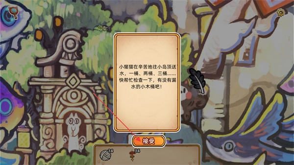 看到任务对话里小黑猩正费力地往小岛上运水,一桶、两桶、三桶……赶紧帮忙检查下有没有漏水的小木桶,之后点击接受按钮接下这个任务。
