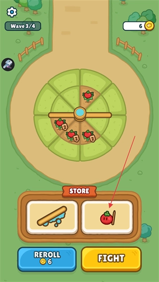 在关卡闯关环节,去STORE里挑选番茄植物放置到圆盘的空位上,等所有步骤都完成后,就可以准备点击FIGHT了。