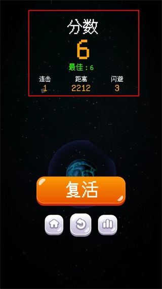 当飞船与星球发生碰撞时,界面会弹出复活提示,玩家可在此选择是否通过复活来继续游戏进程。