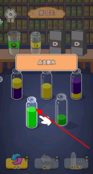 在关卡里点击盛有液体的瓶子,把里面的液体倒进对应的空瓶中,按照液体的颜色进行分类,完成水杯的排序任务。