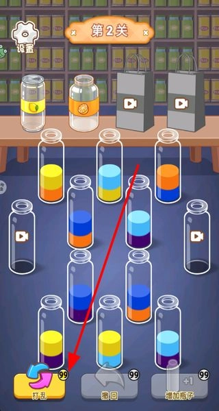 要是排序思路变得混乱,你可以点击打乱按钮来重置瓶子的布局,重新规划液体的归类顺序,以此推进关卡的进程。