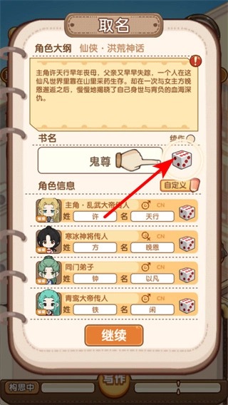 在取名界面,点击骰子按钮能够随机生成书名或者角色信息,确认内容无误后点击继续,就能进入小说创作的下一个环节。