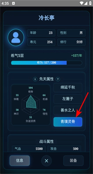 在角色界面里,点击红色箭头所指的“再现灵骨”按钮,就能重置角色的先天属性,让修行资质得到优化。