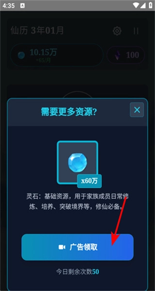 当弹出资源获取提示时,点击红色箭头所指的广告领取按钮,就能获得60万灵石,用以补充修行所需的资源。