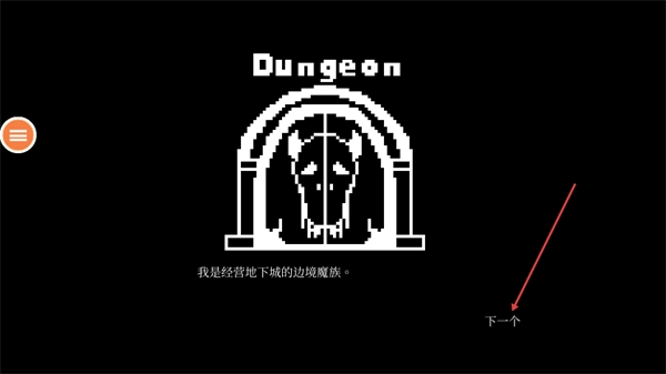 进入标有“Dungeon”的界面后,查看“我是经营地下城的边境魔族”的背景故事,再点击界面里的“下一个”按钮来推进游戏流程。