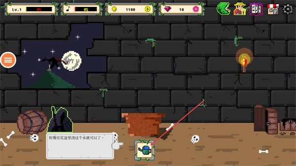 进入游戏界面后,留意弹出的对话内容,接着点击界面里的洒水壶,以此来完成后续的浇水步骤。