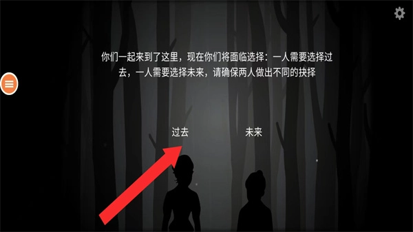进入选择界面后,按照提示点击红色箭头所指的过去选项,完成双人选择不同的剧情要求,这一步是关键操作。