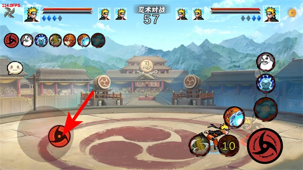 战斗时,点击红色箭头所指的技能按钮,就能释放蓝色特效这类忍术技能,对目标角色造成伤害。