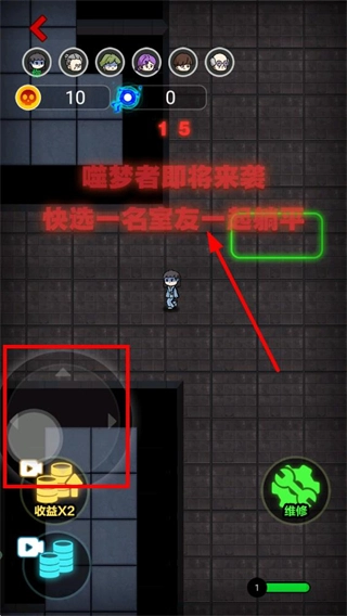 可以通过左侧的虚拟摇杆来控制角色在场景里移动,然后在场景中挑选一位室友,和室友一起参与对局。