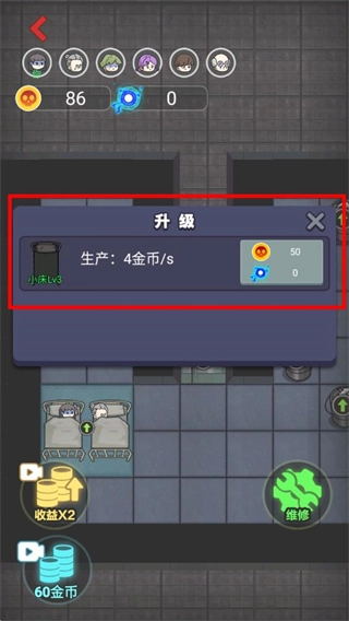 点击小床的升级界面,消耗对应的资源来升级小床这类建筑,以此提高它们生产金币的效率,这样就能获得更多资源,用来支持后续设施的建造和升级操作。