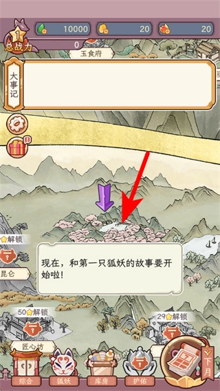 在主界面里,点击红色箭头所指的剧情触发区域,就能开启和第一只狐妖的故事线,进入角色邂逅流程。
