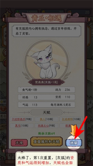 确认狐妖属性符合要求后,点击红色箭头所指的收留按钮,即可完成该狐妖的招募流程,将其纳入你的角色阵容之中。
