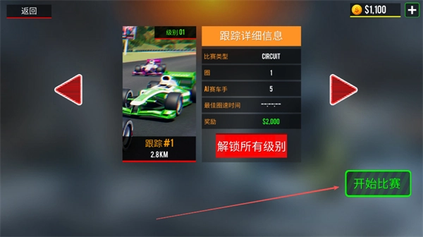 选择赛事时找到跟踪#1,点击开始比赛,即可进入一圈的赛道竞速环节。