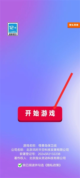 进入游戏启动界面后,点击那个被红色箭头所指的“开始游戏”按钮,就能启动怪岛保卫战的流程,进而进入游戏操作环节。