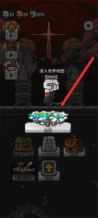在主界面里,点击红色箭头所指的世界按钮,就能进入世界地图界面,从而推进游戏关卡选择的流程。