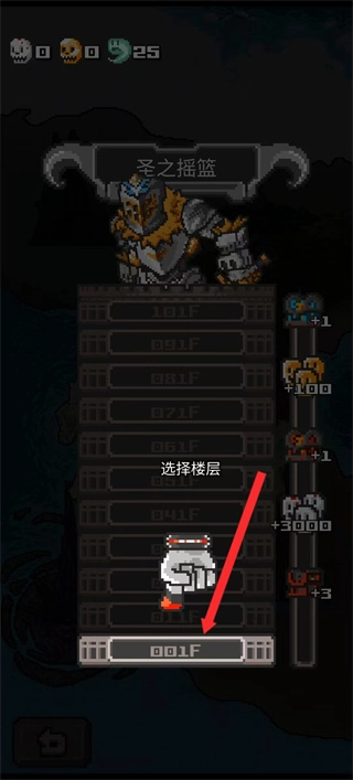 在楼层选择界面,点击红色箭头所指的选项,即可进入圣之摇篮的第一层关卡,开启战斗冒险之旅。