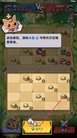 在对战界面里,根据提示点击按钮,消耗水晶就能把爪爪召唤到阵地,点击下方的召唤按钮也可以将爪爪召唤至阵地。