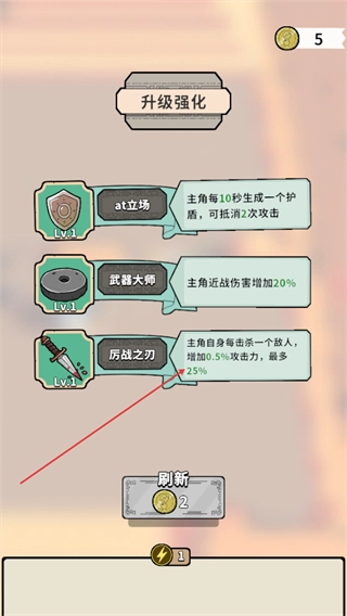 战斗结束后进入升级强化界面,挑选厉战之刃这类属性加成选项,以此增强主角的战斗力。