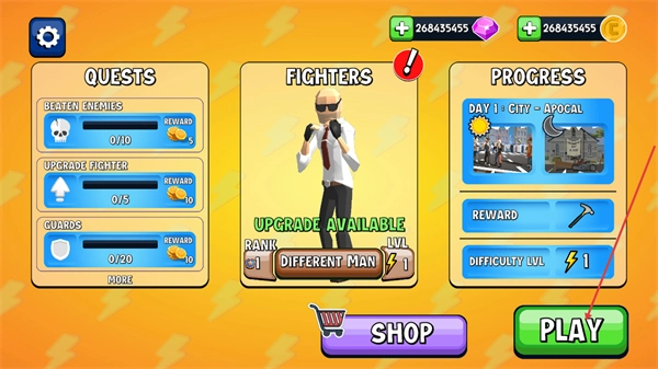 在这个界面点击右下角的PLAY按钮,就能进入DAY1:CITY-APOCAL的对战环节,自己操控的角色是等级1的DIFFERENTMAN,还可以查看任务内容和当前进度。