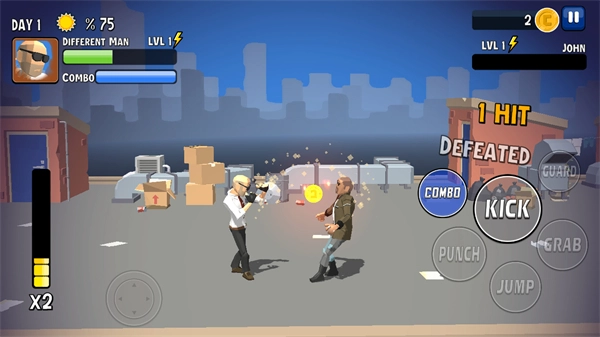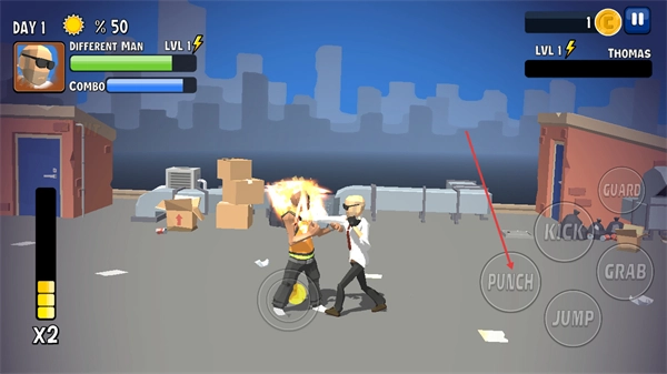 进入DAY1的对战界面后,用方向键控制DIFFERENTMAN移动,靠近场上的对手,准备按下右侧的攻击按钮展开对战。