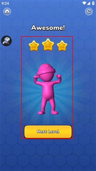 关卡完成后会弹出通关界面,点击NextLevel按钮,即可进入下一个关卡继续进行游戏。