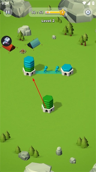 拖动蓝色模块后,它会延伸出路径,让对应的小人移动到目标建筑,从而完成该关卡的堆叠任务。