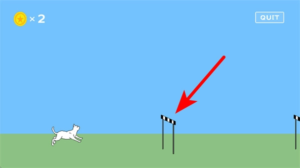 在跑酷场景里,按照红色箭头的指示,控制猫咪朝着跨栏的方向移动,为完成跳跃障碍的动作做准备。