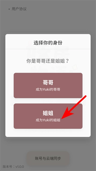 进入身份选择界面后,点击那个被红色箭头指向的姐姐按钮,然后确认以Yuki姐姐的身份来开启游戏。