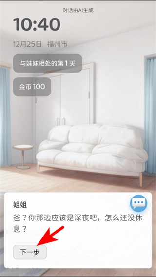 在剧情对话界面,跟着红色箭头的提示,点击下一步按钮来推进对话,这样就能解锁和妹妹Yuki的相处剧情了。