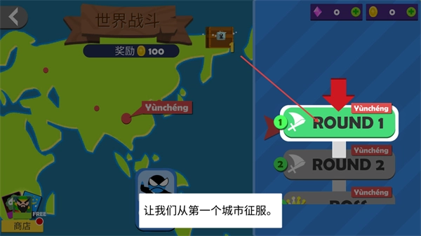 在世界战斗界面,按照提示点击对应的ROUND1按钮,启动该城市的第一回合战斗,以此推动征服进程。