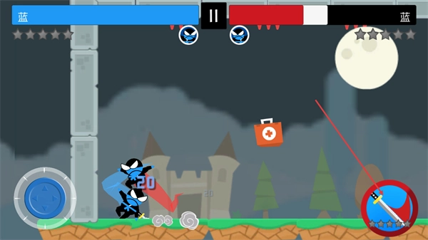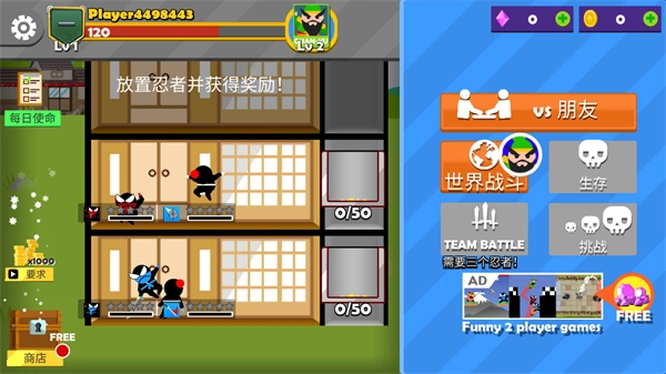 《跳跃忍者大作战》是一款主打双人同屏的趣味点击休闲游戏。玩法十分简单,核心就是不断提升自身实力,击败其他忍者。游戏中,双方玩家需在跳跃过程中,通过投掷飞镖或近战攻击等方式展开对抗,全程保持“边跳边打”的节奏,最终坚持到最后的一方将获得胜利。