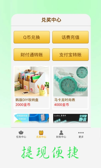 5、提现便捷:可以将金币兑换成话费或Q币,分分钟充值到帐,还支持支付宝和财付通转账