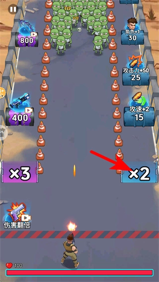 清理完一波僵尸后,操控角色移动到右侧的×2增益区域,获取攻击倍数加成,为接下来应对更多僵尸做好准备。