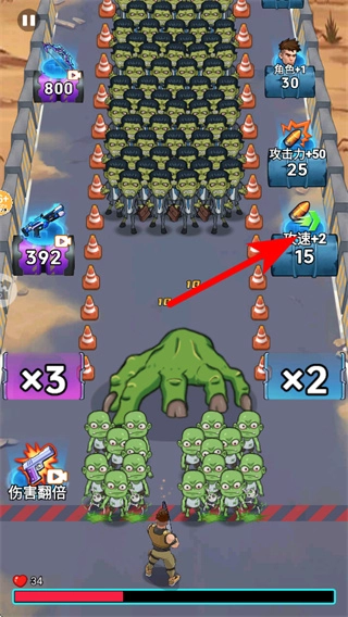 战斗时按照红色箭头的指示行动,对准聚集的僵尸群进行射击,优先清理血量较低的僵尸,借助场景里的×2增益buff来提高战斗效率。