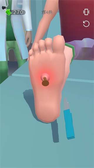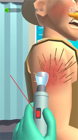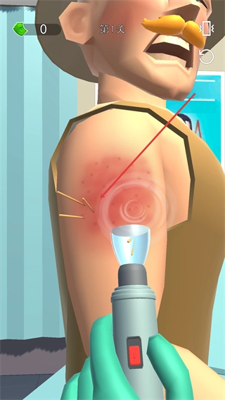 在第1关的场景里,使用带有红色按钮的工具,对准肩膀上的刺进行操作,这样就能开始处理患处,推动关卡进度。