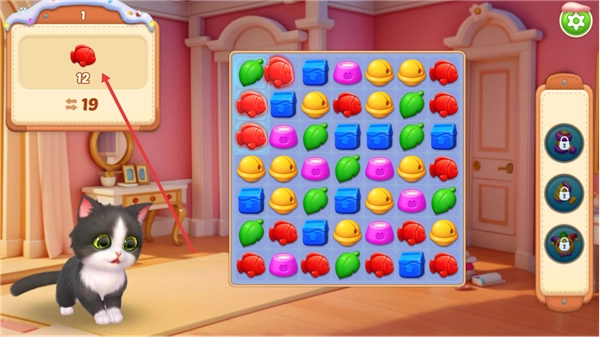 查看目标可知需要消除12个红色鱼形元素,先在消除网格里找到红色鱼的位置,为消除操作做好准备。