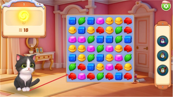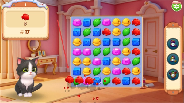 多重玩法深度融合,以经典三消为核心,串联家园建造与萌宠养成玩法,消除闯关获取的资源可用于装修房屋、解锁猫咪互动道具,玩法环环相扣不单调。