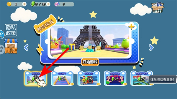 进入游戏界面后,先点击红色箭头所指的关卡图标,接着点击开始游戏按钮,即可进入该关卡的跑酷玩法并开启关卡操作。