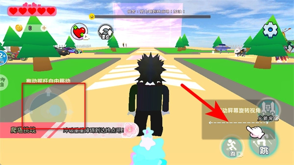 在游戏里,你可以按照红色箭头的提示来操作:拖动屏幕左边的摇杆,就能控制角色移动;另外,滑动屏幕还能旋转视角,这样你就能调整前进方向,顺利避开障碍物了。
