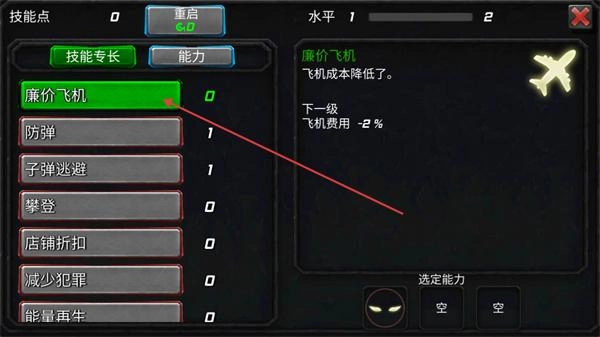 在技能界面中选定廉价飞机技能,借助它能够削减飞机成本的特性,通过配置该技能来增强角色在相关方面的能力。