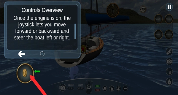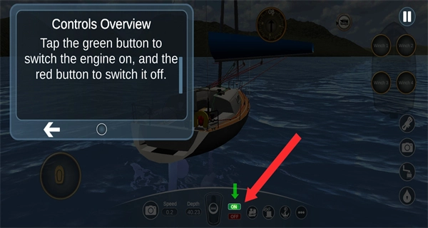 进入操控界面后,需点击绿色按钮启动帆船引擎,以开启动力系统。
