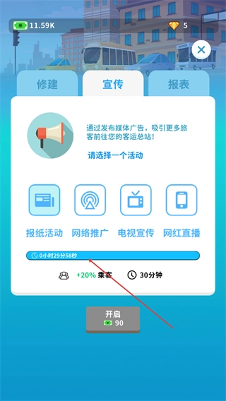 在宣传界面选择报纸活动,消耗相应资源后点击开启按钮,即可触发对应的宣传效果。