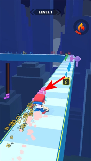跟着红色箭头的指引前进,在跑酷过程中避开路径上的障碍物,尽可能多地收集音符来提高关卡分数,让角色能够顺利平稳地完成整个跑酷流程。