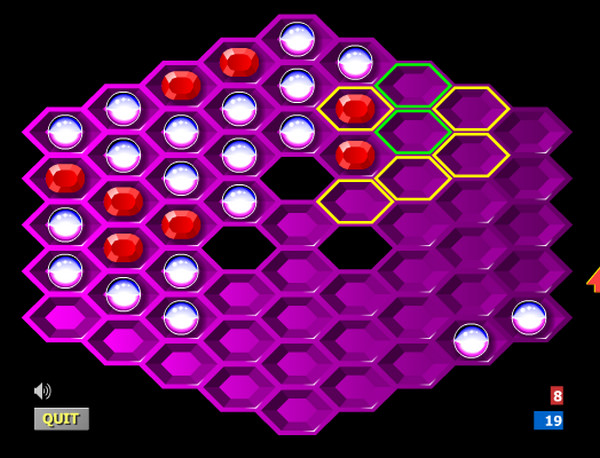 开始游戏,玩家控制红色宝石,电脑控制白色。点一下红色的宝石,就会出现移动选项,宝石周围内1格,属于复制范围,你可以在宝石周围1格内的任何地方复制出一个属于你的红宝石;宝石周围内2格,是行走范围,你可以把你的宝石移动到任何距离2格的位置。移动完毕后,如果有其它颜色宝石在周围1格内,其他颜色的宝石将要被同化,变成你的宝石。最后看谁的最多,谁就是赢家。