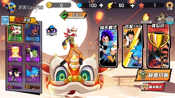 在这个界面选择角色,比如选中拉面丸这类角色后,你可以挑选闯关模式或者匹配1v1之类的玩法,接着点击快速开始就能进入游戏了。