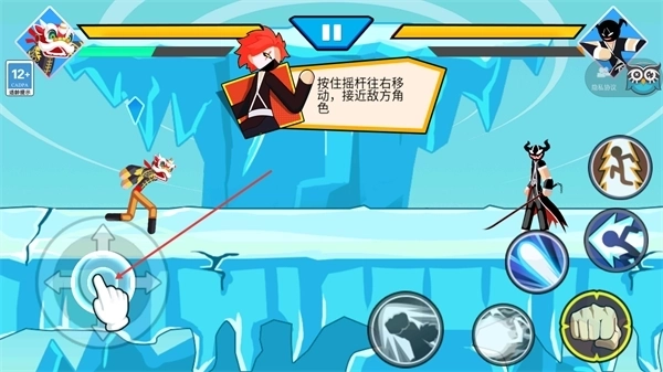 进入战斗后,根据提示按住摇杆向右移动以接近敌方角色,通过操作摇杆来控制角色的移动方向,逐步靠近敌方角色,为接下来的战斗做好准备。