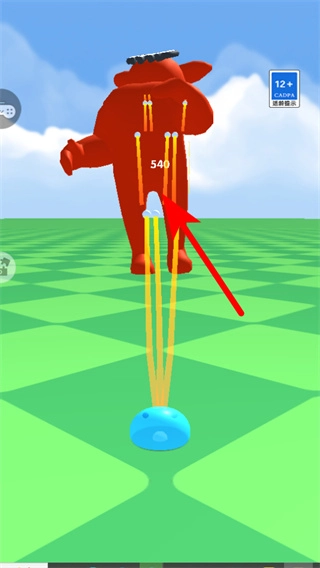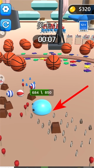 跟随红色箭头的指引,操控球体撞击巨型玩偶来获取积分,以此提升关卡得分,进而推进关卡进度。