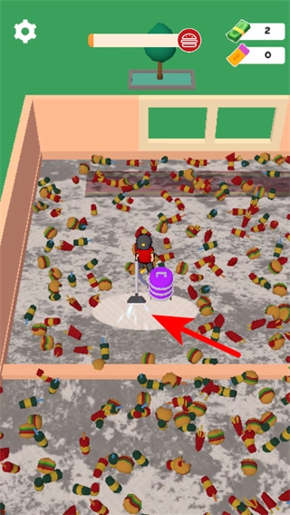 游戏里按照箭头的提示,控制吸尘器移动来清扫食物垃圾,朝着把场景清理干净的目标推进,要留意覆盖那些垃圾多的区域。