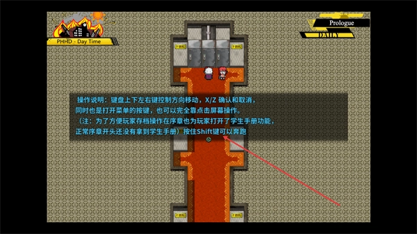 当前界面呈现操作指引,可通过键盘的上下左右键控制移动,X键用于确认、Z键用于取消,按住Shift键能够奔跑,此外也支持点击屏幕进行操作。